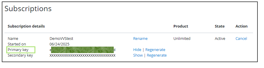 c) Under subscriptions, click on Show to see the value of the primary Key. Copy and save that value for later use.